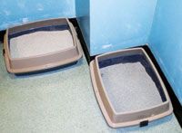 Another study was performed comparing two litter odor-control additives, activated carbon and sodium bicarbonate.13 These odor-control additives are used in two top-selling national litter brands. About 32 cats (the number of cats varied because of adoptions) housed in four colony rooms at a shelter were given access in each room to two litter boxes and two base litters that were identical except for the odor-control additives (Figure 1). Excrement was collected from the boxes each morning after four consecutive 12-hour overnight test periods. The amount of excrement was analyzed by using both parametric (analysis of variance [ANOVA]) and nonparametric (Friedman) tests, using a randomized block design. The cats showed significant (P < 0.05) increased usage of the litter box with the activated carbon additive, suggesting that the cats preferred activated carbon to sodium bicarbonate as an odor-control additive.