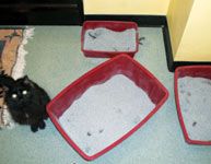 It has been hypothesized that one cause of feline toileting problems is litter box aversion due to small box size. Some experts recommend that litter boxes should be 1 ½ times the cat's body length; however, to my knowledge, no evidence supports this claim aside from anecdotal reports and common sense. Consequently, I conducted a study to identify if cats had a preference for a certain box size when all other variables were equal.14 To determine litter box size preference, 32 cats housed in four colony rooms in a shelter were given access in each room to three commercially purchased plastic litter boxes equal in every parameter except size (Figure 3). The boxes were small (14-x-10-x-3.5-in), medium (18-x-15-x-5-in), and large (22-x-16-x-6.5-in) in size. The same commercial clumping clay litter was used in all boxes. The study was conducted over 21 hours. Excrement deposited in the boxes was collected every two hours during the daytime and in the morning, and the excrement was then counted, weighed, and recorded. Again, the data for each room were analyzed by using parametric (ANOVA) and nonparametric (Friedman) tests. Although statistical significance was not achieved, the trend was that the cats preferred the large boxes to the medium and small boxes based on the number of deposits and total weight of excrement.