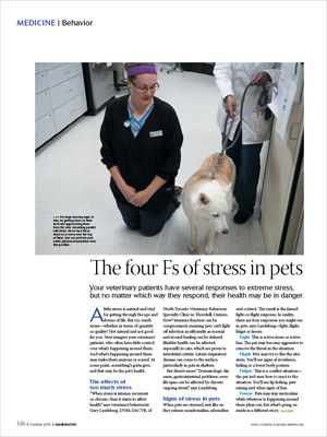 How the photo and article were presented in the October print issue of dvm360 magazine.The photo accompanying the article “The four Fs of stress in pets” in the October issue of dvm360 shows one of the worst ways to examine a fearful dog (especially a dog the size of the one pictured, or larger). By kneeling, the examiner will have little chance of quickly moving away from a dog if it should lunge at her.