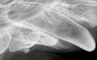 Photo 2: The left mandibular canine tooth (304) is contacting the distal aspect of the left maxillary third incisor (203).
