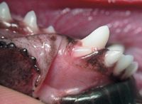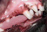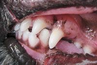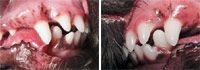 More important, the left mandibular canine tooth (304) was contacting the distal aspect of the left maxillary third incisor (203) (Photo 2). Sole contact of this type does not disperse occlusal forces evenly, but rather concentrates them on two teeth. Under normal conditions, occlusal contact is shared by multiple teeth, including the incisors and molars in dogs. Left alone, wear will likely progress to damage the incisor, exposing dentin and compromising tooth vitality. Mandibular canine contact with the palatal mucosa is also likely if wear continues.