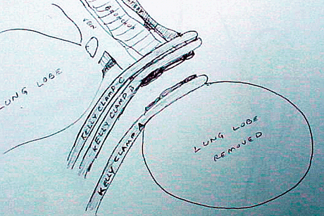 The lung lobe is removed by cutting the entire pedicle with Metzenbaum scissors between the distal most clamps (Figure 1). The scissors tips are tilted slightly to produce a “tissue bumper” of 1-3 mm above the distal most hemostatic forceps. This bumper helps prevent the pedicle from sliding through the forceps.