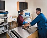 Lots of visibility also makes clients comfortable, Dr. Kendrick says. Windows (with blinds for optional privacy) provide views into grooming, and a glass door in the special procedures room gives clients a view of the high-tech equipment. A self-service retail store lets pet owners grab the food they need and pay at the reception desk.