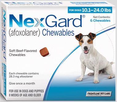 NexGard, a chewable for dogs, was approved by the FDA in 2013 to treat and prevent flea (Ctenocephalides felis) infestations and to treat and control black-legged tick, American dog tick (Dermacentor variabilis), Lone Star tick (Amblyomma americanum), and brown dog tick (Rhipicephalus sanguineus) infestations in dogs and puppies 8 weeks of age and older, weighing at least 4 lb. Each chewable provides 1 month of protection.