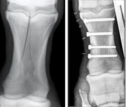 Above are before-and-after views of the right foreleg of a horse that sustained a hairline pastern-bone fracture in Olympic cross-country competition. Jack Snyder, DVM, PhD, Dipl. ACVS, and another doctor made the repair with four compression screws.