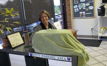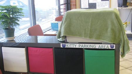 Client care specialists see clients coming in with their carriers and they direct them right to the kitty parking area to place their carriers on top of the unit, and then they retrieve a clean towel from the cubby below and cover the carrier, helping the cat to feel protected. Who would have thought that such an inexpensive piece of furniture could fulfill so many of our needs?