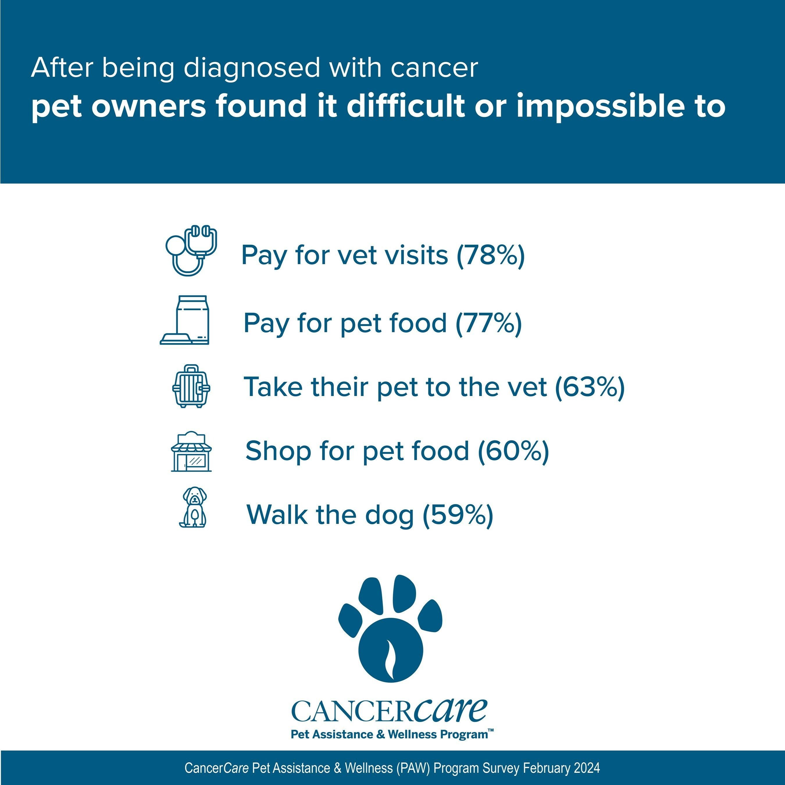 Before their cancer diagnosis, the majority of pet owners could manage to purchase pet food (93%) and cover veterinary expenses (91%). However, following their diagnosis, they struggled or were unable to afford pet food (77%) and veterinary appointments (78%).2