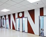 Boarding: A luxury boarding area surrounds the training and daycare room. The boldly colored word canine leaves no question as to which area of the hospital this is.