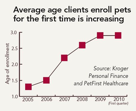 Since 2005, the average age clients enroll their pets in insurance programs has risen from 1.3 to 2.9 years old. And Dr. Robin Downing, owner of the Downing Center for Animal Pain Management in Windsor, Colo., was initially taken aback by this trend. “I was surprised by that statistic,” she says. “Pet insurance is growing in popularity, so it would make sense for the age of enrollment to drop.”