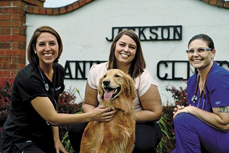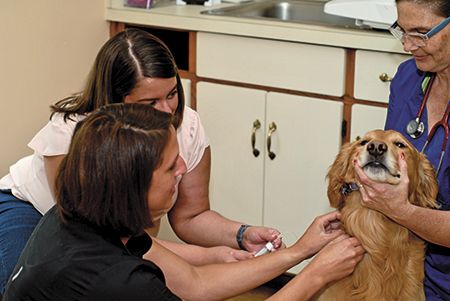 From right to left: Valerie Partch, DVM; Andrea Cole, holding Truman; and veterinary technician Lisa Schelinski.