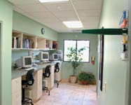 Two-toned porcelain tile sealed with epoxy covers the floor and six-inches up the walls in the waiting area and retail space. The exam rooms feature LCD monitors to play client-education DVDs and to show clients what the doctors or technicians are viewing in the microscope; and during surgery, ultrasonography, or endoscopy. The treatment islands are stainless steel. And this list of high-quality touches goes on and on, which was Dr. Bailey's plan from the beginning.