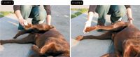 While in this position, have the dog hop from side to side by holding the back end and one forelimb up without supporting all the weight and pushing the animal laterally on the side of the tested limb (Figure 9). This evaluates both conscious proprioception and strength since the weight of the dog is shifted to the tested side. Because motor function is also evaluated by these manipulations, it will be necessary to support the weight to really evaluate the proprioception component in a weak animal. When evaluating hopping and placing reactions, poor initiation of the movement suggests a sensory (proprioceptive) deficit, whereas poor performance of the movement suggests a motor problem.