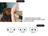 The second cranial nerve, the optic nerve, is the afferent nerve for vision and the pupillary light reflex (PLR). It is evaluated by the menace reaction and the PLR (see oculomotor nerve below). The menace reaction not only evaluates the second cranial nerve but also the ocular components, the optic chiasm and other structures of the visual pathway, the contralateral occipital cortex, and the ipsilateral cerebellum and facial nerve. Test the menace reaction by holding the pet's head, covering one eye with one hand, and making a forward gesture with the other hand (Figure 1). The expected response is closure of the eyelids, possibly accompanied by a backward movement of the head and retraction of the eye. When making the forward gesture, be careful not to get too close to the eye, as the air movement produced by the hand movement might stimulate the sensory fibers of the cornea and produce a false positive reaction. Remember that the menace reaction is a learned reaction and is absent in kittens and puppies up to about 12 weeks old.2