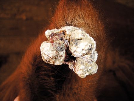 A 3 cm sarcoid tumor on a horse's ear. Sarcoids often develop as small bumps under the skin or scaly lesions like the one in the photo. Depending on their location on the horse's body, tumors like these can often be removed by a veterinarian. However, in certain horses sarcoids tend to regrow after surgery, sometimes to much larger tumors that are impossible to cure.