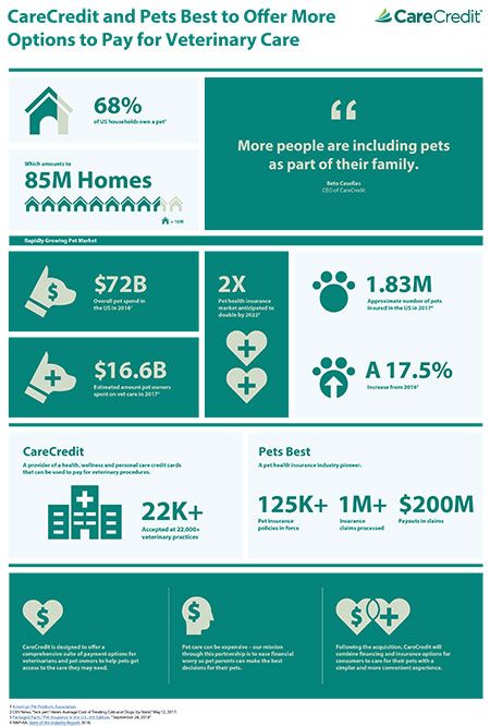 “CareCredit will leverage Pets Best's leading technology and strong experience in the growing pet health insurance market,” reads the release. “Pets Best will have access to CareCredit's deep healthcare market penetration and access to veterinary practices and veterinary industry associations. In the future, CareCredit will offer consumers access to comprehensive care for their pets by combining financing and insurance options, providing a seamless customer experience.”