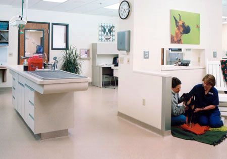 Hospitals can provide places for clients to visit critically ill pets. It's not easy, as it involves putting clients right in the middle of things, but it may be worth the design challenge. A worried owner will appreciate the chance to be close to their loved pets. Clients at Pet Crossing Animal Hospital and Dental Clinic in Bloomington, Minnesota, appreciate the recovery space above. (Photo courtesy photographer)Equine veterinarians often do work out on a farm call-in the whipping wind, a racetrack, under an overhang. Horse doctors work where the horses are and most often in front of their clients. Veterinary architect Heather Lewis, AIA, NCARB, of Animal Arts in Boulder, Colorado, says many cat and dog owners want their hospitals to break down the barriers between doctor and client.