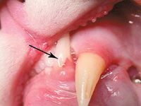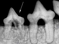 Photo 1: A triangular-shaped defect in the tooth at the gingival margin (arrow) is evident. This generally occurs in Type 1 and longer-standing Type 2 tooth resorption.