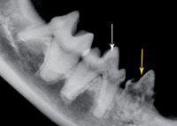 Photo 2: The right mandibular fourth premolar, tooth 408 (white arrow), has a subtle crown lucency but an intact periodontal ligament space surrounding the roots consistent with Type 1 tooth resorption. The third premolar, tooth 407 (yellow arrow), has more pronounced crown lucency and no discernable periodontal ligament space surrounding the roots, which is typical of Type 2 tooth resorption.