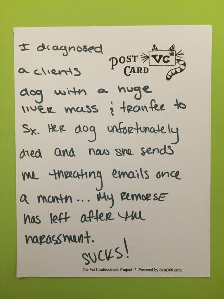"I diagnosed a client's dog with a huge liver mass and transfer to surgery. Her dog unfortunately died and now she sends me threatening emails once a month ... My remorse has left after the harassment. Sucks!"