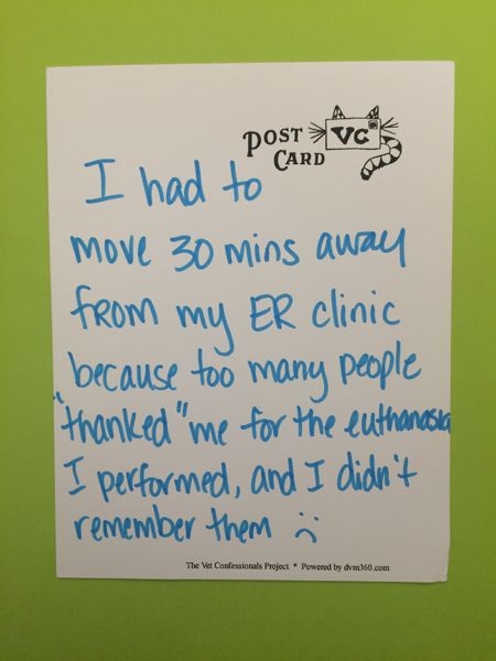 "I had to move 30 minutes away from my ER clinic because too many people 'thanked' me for the euthanasias I performed, and I didn't remember them." :(