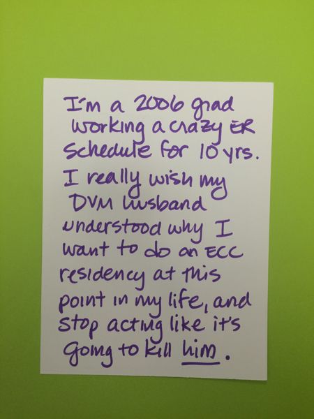 "I'm a 2006 grad working a crazy ER schedule for 10 years. I really wish my DVM husband understood why I want to do an ECC residency at this point in my life, and stop acting like it's going to kill him.