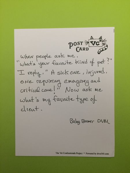 "When people ask me, 'What's your favorite kind of pet?' I reply, 'A sick one, injured, one requiring emergency and critical care!' Now ask me what's my favorite type of client." -Baby Boomer DVM