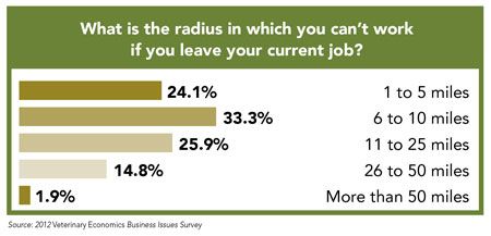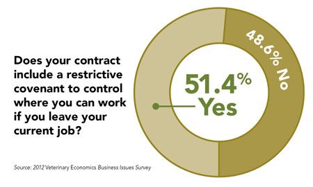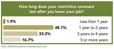 According to data from the 2012 Veterinary Economics Business Issues Survey, 51 percent of associates now work under a contract that includes a restrictive covenant. The majority of veterinarians (26 percent) said they can’t work within an 11 to 15 miles of their former practice, and 48 percent said their restrictive covenant lasts one to two years they leave their job. Check out the following pages to learn more dirty details about restrictive covenants and noncompetes.