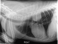 The appearance of primary lung tumors varies from a solitary mass (Figure 1) to involvement of an entire lung lobe or multiple lobes (Figure 2), indicating metastatic disease or multicentric pulmonary tumors. Radiographic assessment may be confounded by atelectasis secondary to pneumothorax or pleural effusion. Pleural effusion may result from regional lymph node metastasis, extension of the tumor into the pleura, or concurrent disease such as congestive heart failure or other nonneoplastic processes such as hypertrophic cardiomyopathy, feline infectious peritonitis, and chylothorax.1,14 But keep in mind that pleural effusion devoid of neoplastic cells on cytologic examination does not necessarily rule out primary pulmonary neoplasia.14,19,28
