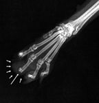 7. A radiograph of the right front foot of the cat in Figure 6 reveals bony destruction involving the third digit (long arrow) and soft tissue swelling (short arrows). (Photograph courtesy of Dr. Laura Garrett.)