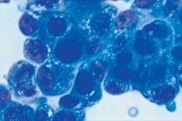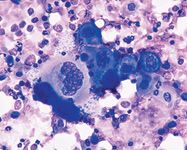 3. A photomicrograph of a cytologic sample revealing primary lung adenocarcinoma in a geriatric dog. A cohesive cell population is identified with cytologic criteria of malignancy including anisocytosis, anisokaryosis, multiple nucleoli, nuclear molding, and foamy cytoplasm (Wright's stain, 1,000X). (Photograph courtesy of Dr. Laura Garrett.)