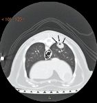 5. A thoracic computed tomographic image from a 12-year-old castrated male domestic shorthaired cat presented for evaluation of inappetence and weight loss. A cavitated mass (arrows) is identified in the periphery of the right caudal lung lobe. The mass was removed with thoracoscopic lung lobectomy, and the histologic examination results revealed a well-differentiated adenocarcinoma. (Photograph courtesy of Dr. Kristen O Dell-Anderson.)