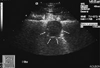 4. A thoracic ultrasonogram in a dog with a peripherally located primary lung tumor demonstrates a hypoechoic lesion immediately adjacent to the thoracic wall (arrows). Ultrasound-guided fine-needle aspiration improves the chances of a diagnostic sample. (Photograph courtesy of Dr. Laura Garrett.)