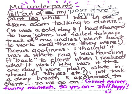 My underpants fell out of my pant leg while I was in an exam room talking to clients!! (It was a cold day and I had changed to long johns but failed to keep track of my undies! Went back to work and there they were!) Bonus goofiness: I thought it was a white rag and was handing it “back” to a client when I realized what it was!! Why was it the day I wore plain white instead of stripes? I just took a deep breath and explained to the client … so we could go on. Great career, funny moment. Thirty years on-still happy!