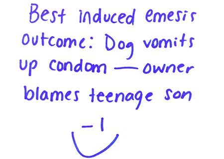 Best induced emesis outcome: Dog vomits up condom-owner blames teenage son.