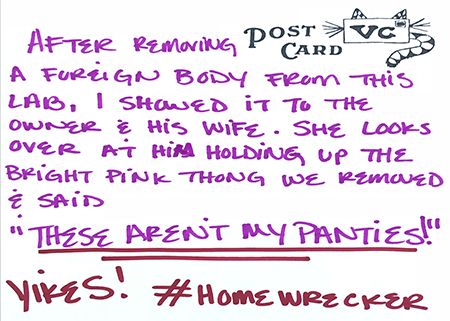After removing a foreign body from this Lab, I showed it to the owner and his wife. She looks over at him holding up the bright pink thong we removed and said, “These aren't my panties!” Yikes! #homewrecker