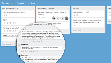 At Dr. Santi's former practice, they had a doctors-only Trello board. The topics included medical questions, management duties and clinic repairs. As an example, she says, “We had a doctor post a GDV (gastric-dilatation volvulus) card. We had two GDV patients come in close together-one died, one lived. We used Trello to discuss the difference between the cases.” She says doctors posted the latest articles on GDV treatments and information they had learned in recent lectures.