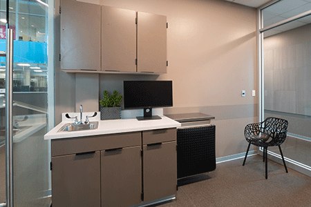 Glass opens up the front and back of this veterinary exam room at The PARC. Practice owner Dr. Steve Hotchkiss says, "Millennials ask, 'Why?' when I say I want to take [their pet] to the back. Millennials purchase experiences, not things.""It develops from the start from 'What do I want to deliver?' to 'What does the consumer want?' Dr. Hotchkiss says. "I just want to think about me and how the staff concerns me, that's my natural default. It's all our natural defaults. And clients do it too. They think we're in the back watching Netflix, so we need to go and update them every 10 minutes in every exam room and tell them why we're not in the room."